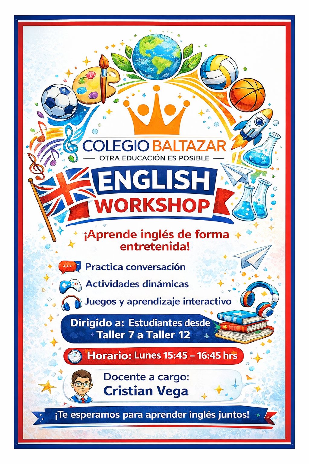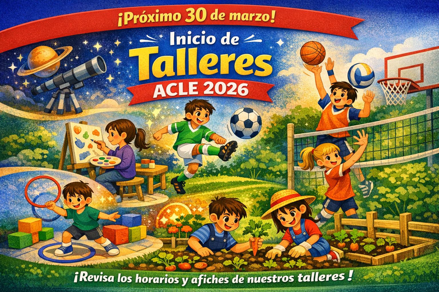 Con gran entusiasmo informamos que el próximo 30 de marzo darán inicio los Talleres ACLE 2026 en nuestro colegio. Estos espacios están diseñados para potenciar las habilidades, intereses y talentos de nuestros estudiantes, ofreciendo instancias de aprendizaje complementarias y recreativas.