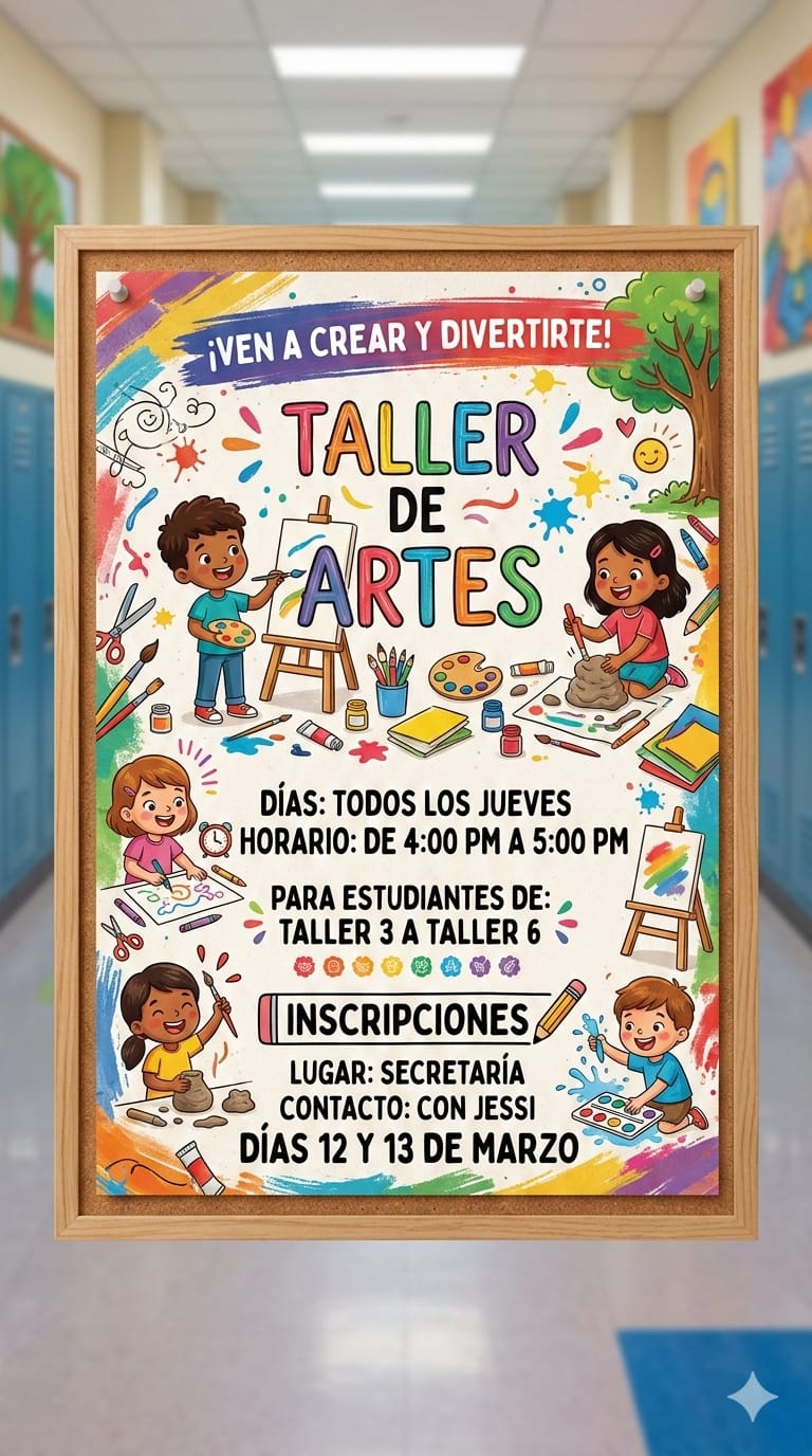 En esta sección podrán encontrar los afiches de cada taller, donde se detallan los horarios y días de realización, para que las familias puedan organizarse y acompañar a sus hijos en la elección de las actividades que más les motiven.